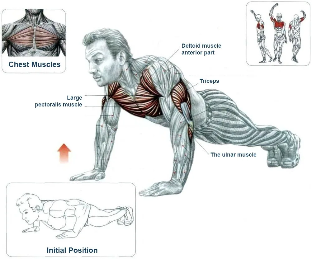 While different types of push ups can better work specific muscles, all of the modifications offer unsurpassed value in providing natural physical strength and muscle mass. Push ups are dynamically working your upper body muscles, create load for all the large and small muscles of the chest and the deltoid muscle and use all three triceps muscles as well – the most important muscles of the upper arm.