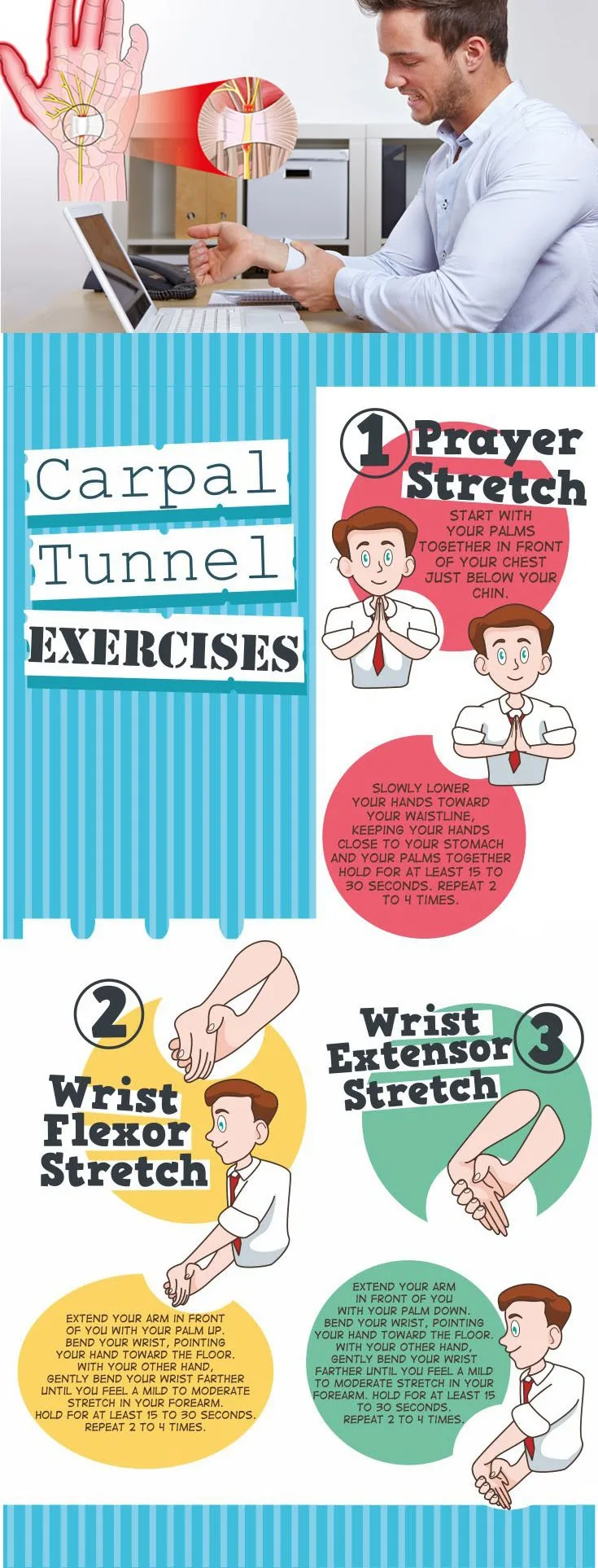 Carpal tunnel syndrome can cause numbness, stiffness, and pain in the fingers and hand. There is no known way to completely prevent carpal tunnel, but some exercises can lower your chances of developing it and needing surgery for treatment. Most doctors for problems like carpal tunnel recommend stretches to be done throughout the day.