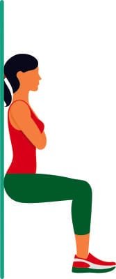 Start with your back against a wall and your feet shoulder width apart, about two feet from the wall. Gradually slide your back down the wall until your thighs are parallel to the ground. Make sure your knees are directly above your ankles and keep your back flat against the wall. Hold the position for 60 seconds.