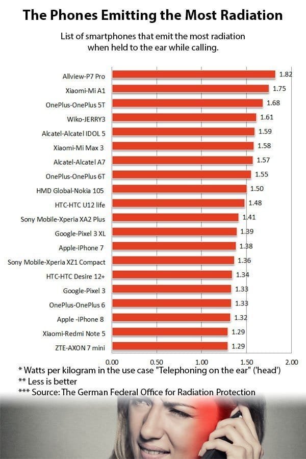 The following infographic shows smartphones that emit the most radiation when held to the ear while calling.